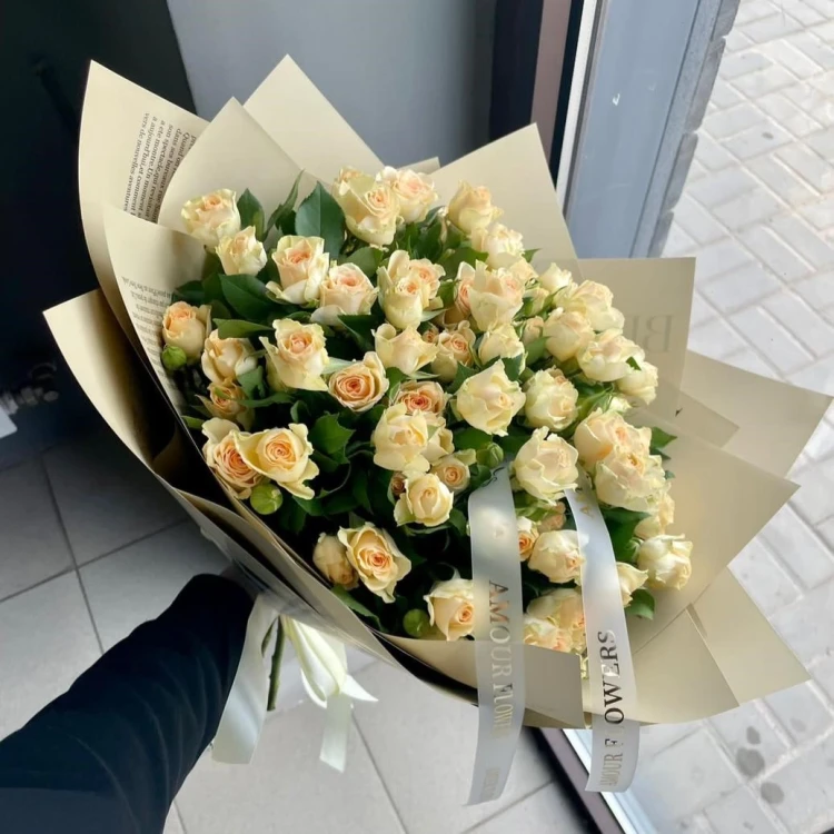 Этот потрясающий букет эмоций и нежности притягивает взгляд своей богатой палитрой чарующих оттенков и тонким ароматом. Кустовые розы, с изящно раскрывающимися пышными цветами, придают композиции игривость и легкость, а одноголовые розы добавляют изящества и элегантности. Каждый цветок является уникальным произведением искусства природы. Упаковка, украшенная изысканными деталями, подчеркивает драгоценность этого букета. Это настоящее проявление любви и заботы, идеальный подарок для особого случая или просто, чтобы подарить радость и улыбку.