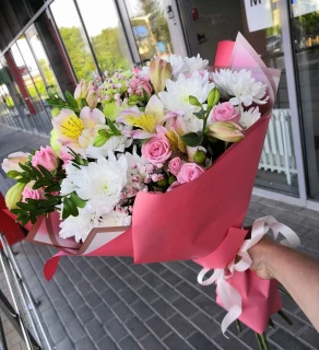 Сочетая кустовые розы, изящные лилии, яркие альстромерии и пышные хризантемы, этот букет является шедевром флористического искусства. Каждый цветок тщательно подобран для создания утонченного, но яркого букета. Представленный в спокойной, нежной упаковке, он идеально подходит для важных моментов, подчеркивая красоту и оригинальность событий.